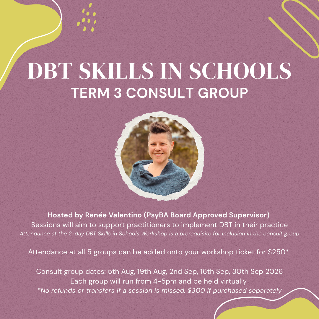 This two-day workshop will be facilitated by psychologist Renée Valentino, a respected clinician working across schools and private practice with over 15 years’ experience in community mental health, education settings, and complex youth presentations. Designed specifically for school psychologists and counsellors (but applicable to all clinicians working with school-aged young people), the workshop focuses on building confidence in the practical use of DBT skills with children and adolescents.